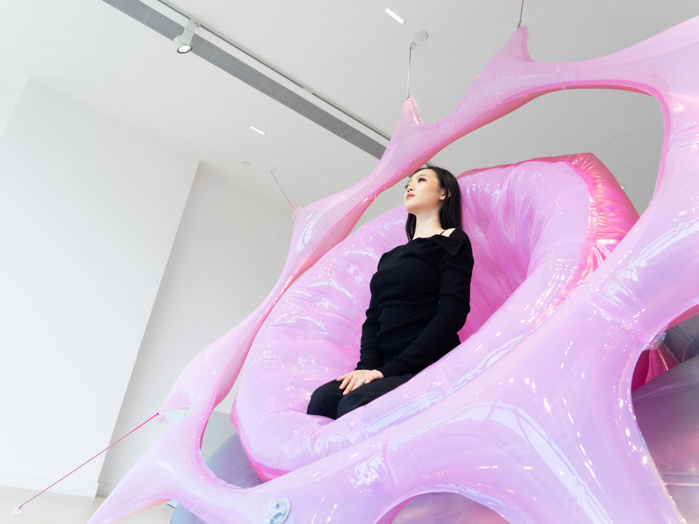 “At the heart of ‘Bao Rong is also me, two!✌️’ lies the colossal ‘The Hole’, a PVC pop extravaganza, which dares audiences to crawl inside its soft, unyielding exterior. At its entrance, a sunflower-like ruffle bursts open, its tendrils reaching towards the Hong Kong jungle. When the sculpture is dormant– that is when the artist is not inside of it, performing– a pair of helpless, eerily mindless prosthetic limbs dangle from its exit, swaying to a hypnotic rhythm”